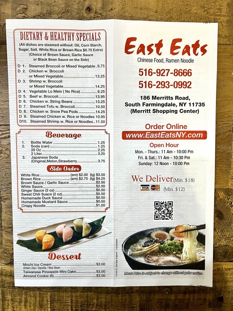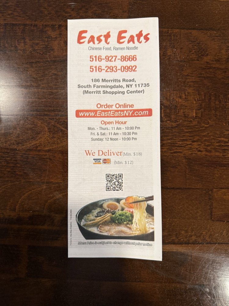 Looking for a local gem that offers delicious Asian fusion cuisine and exceptional service? Look no further than East Eats. Located at 186 Merritts Rd in South Farmingdale, NY, this spot is a favorite among locals for its tasty ramen, sesame chicken, garlic wontons, and more. East Eats not only serves up fantastic food like spring rolls and steamed vegetable dumplings but also provides a clean and efficient dining experience with a smile. Customers rave about the good taste, generous portions, and friendly service provided by this family-run establishment. Whether you're craving a comforting bowl of chicken rice soup or a flavorful dish like Pad See Yu, East Eats delivers on all fronts. Don't miss out on this hidden gem in the heart of Farmingdale.